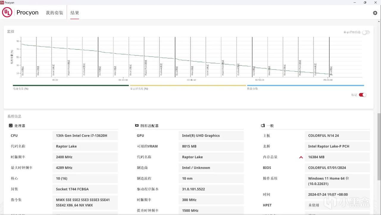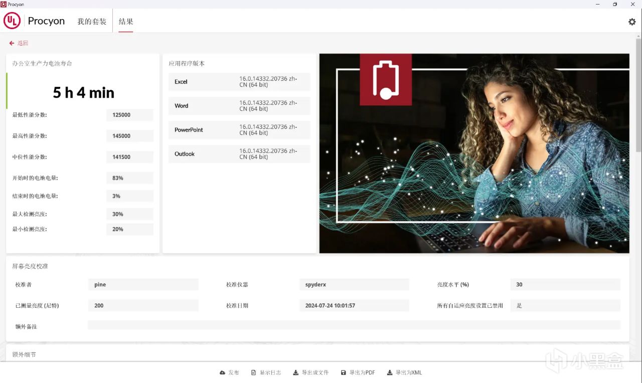 ▼使用UL Procyon進行生產力場景續航測試,電量從80%下降到電腦自動關機,共堅持了5小時零4分鐘,合理推斷滿電狀態下續航時間在6小時20分鐘左右。