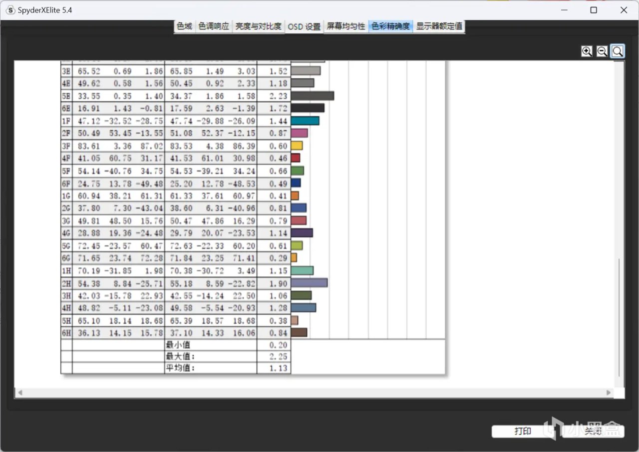▼在色準上,最小值0.2,最大值2.25,平均值ΔE=1.13<2,色準表現相當優秀,不愧是定位於AI創作的筆記本,整體測試下七彩虹將星X15 AT 23的屏幕素質可圈可點