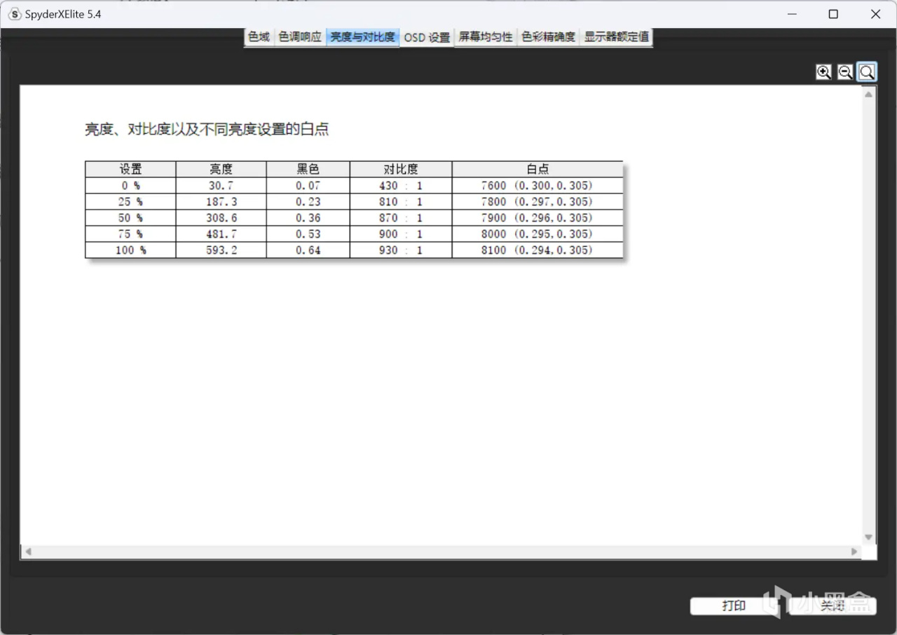 ▼接着是亮度、對比度測試,實測最高亮度593.2nit,反向虛表了屬於是,對比度930:1,表現優秀,足以滿足遊戲中的暗場景觀察以及亮度需求。由於只有10檔調整範圍,沒有辦法卡到紅蜘蛛的25%與75%,最終只能測試到20%、80%兩檔。