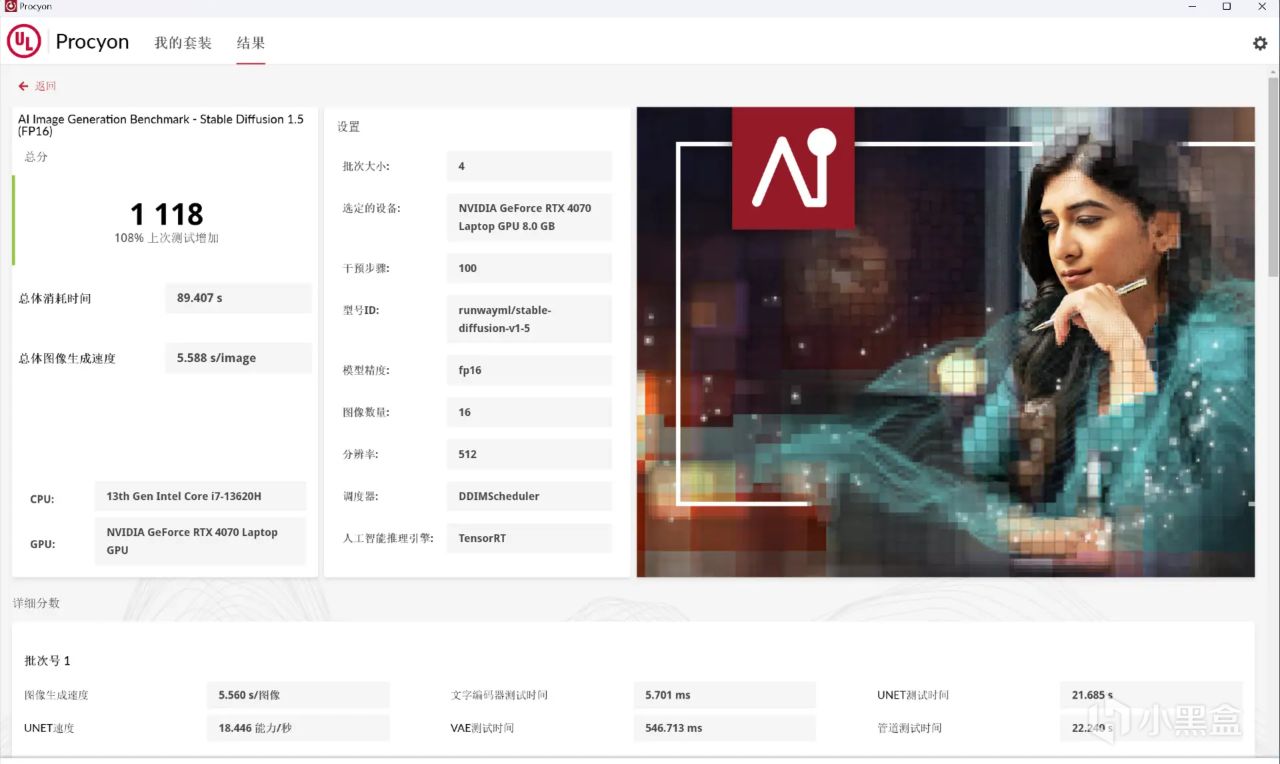 ▼目前AI性能基準測試的量化工具主要是UP Procyon,使用Stable Diffusion 1.5模型進行AI Image Generation Benchmark基準測試,測試使用默認參數,最終獲得了1118分的成績,總用時89.407秒,平均速度5.588秒/張。