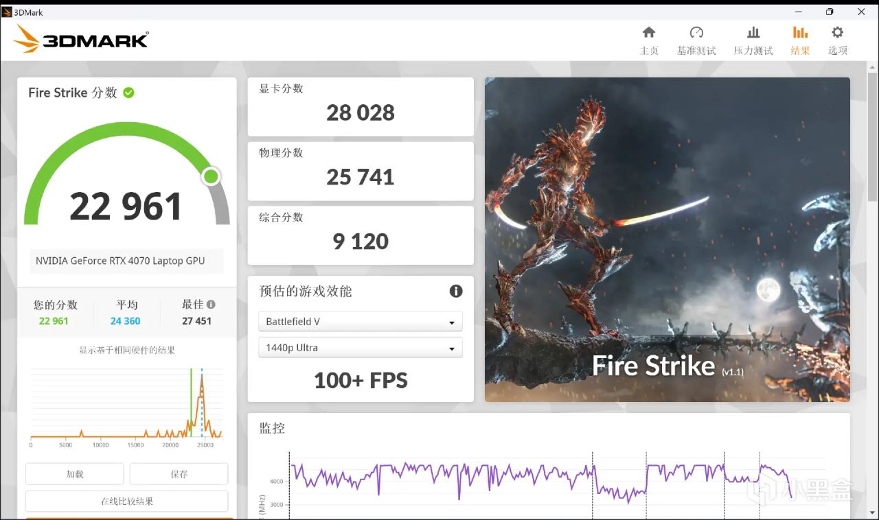 ▼測得Fire Strike跑分22961分,顯卡分數28028分,物理得分29732分,預估1440P下戰地5可以在100+ FPS遊戲。顯卡分數比“滿血”的七彩虹將星X15AT RTX 4060 筆記本電腦 GPU高1.82%。