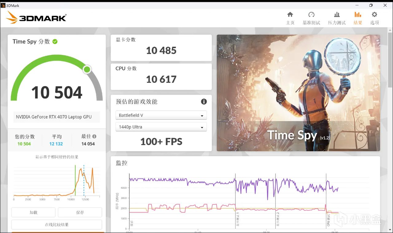 ▼就目前而言,能夠代表3A大作性能的Time Spy跑分無疑更爲用戶所重視,最終測得Time Spy跑分10504分,顯卡分數10485分,在Time Spy中非滿血RTX 4070與滿功耗RTX 4060的顯卡分數幾乎相差無幾。