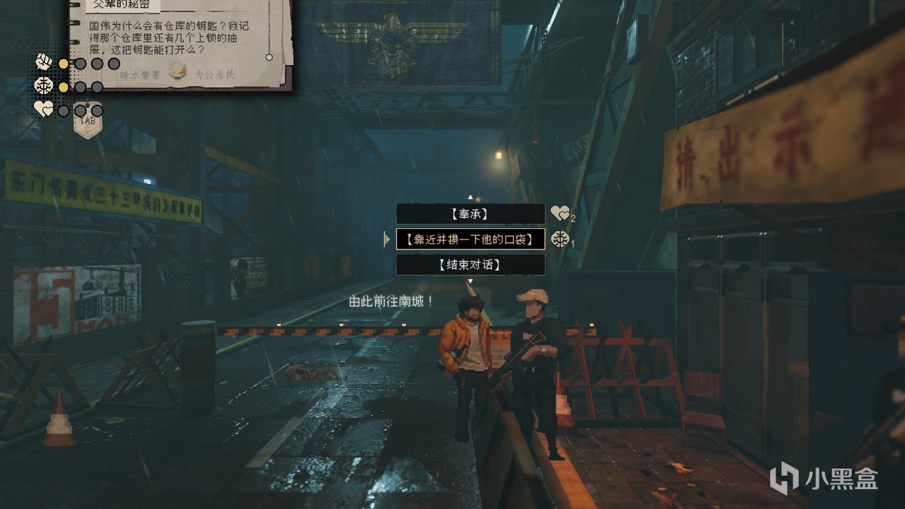 遊戲中我們擁有情商(心號)、力量和思維三種可消耗屬性,和NPC之間的互動會有大量的對話選項和結果,那麼使用這些屬性可以達成想要的分支,比如去南城時,房國偉不讓過,你可以直接揍他也可以動之以情。
