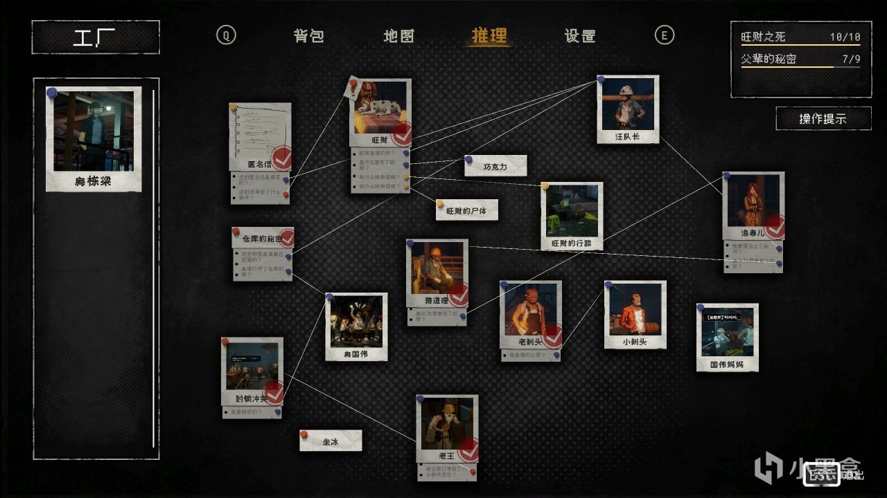 在《殺死影子》你可以用類似於刑偵片中常見的那種公告板來貼出你的疑問,這些疑問涉及到的人和事,這個部分好玩的地方大概在於:事件與事件之間存在關聯,它們各自可能是冰山的一角,但拼湊出的全貌也許會讓人打出意外之外——比如我開始以爲汪隊長就是刻板印象中的貪婪勢利的壞人,但事件拼湊下,得到的確是完全沒有想象到的事實。