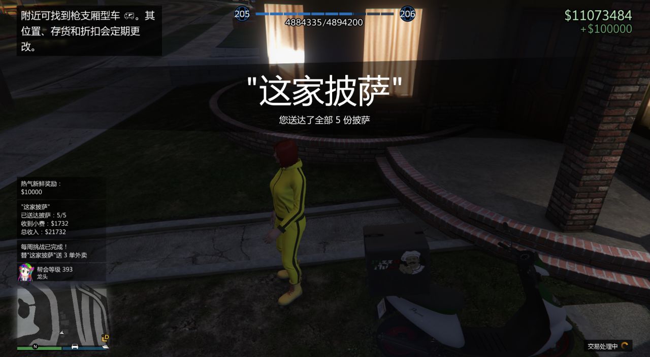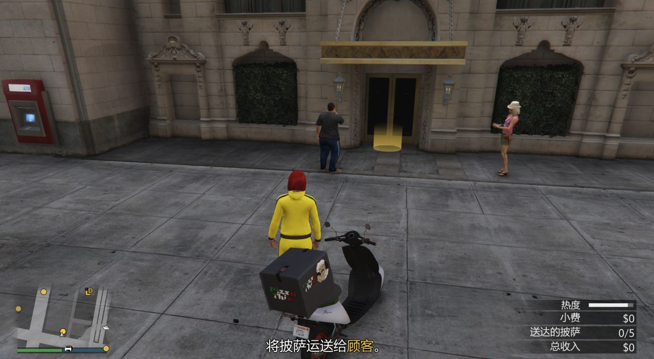 当玩家角色和摩托车同时距离某配送点约 10 米时,方能下车并进入配送点的黄圈触发动画,这份披萨才送配送完成(无法在车上触发动画)。