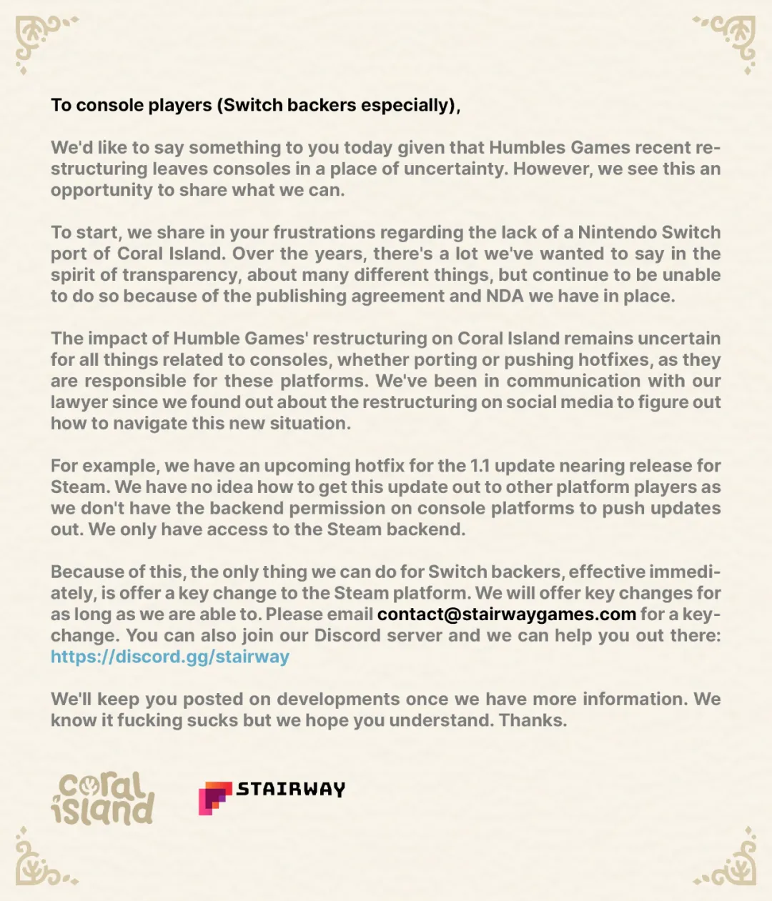 种田游戏《珊瑚岛》由于主机版是HB在负责,受此重组影响,《珊瑚岛》开发商发布公告,原计划“后续推出”的Switch版目前陷入了不确定状态。