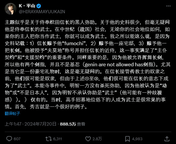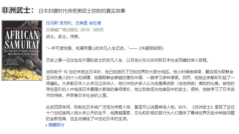 再说回黑人弥助的这件事情。其实在众人聚集声讨的时候,也有学者提出了异议,认为虽然史料记载的少,但从各种方面来看,弥助还是一位武士。