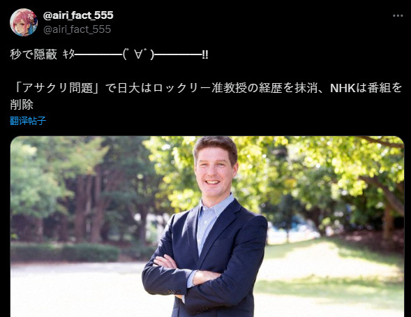 目前,这位洛克利教授已经删除了自己的所有社交账号,而日本大学的官网也已经删除其简介。有传闻说到洛克利已经被日本大学解雇,不过是否真实目前还不得而知。