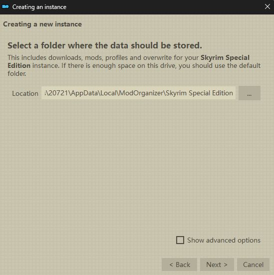 这个位置一定要认真挑选,最好是放在游戏本体之外,自己能记得到的位置,以我个人的文件结构举例,就是在Skyrim Collection内新建一个名为Instance的文件夹,将其设为实例的目录所在处。这个位置最好有充足的空间(建议20-100GB,取决于你的野心)。取一个自己记得住的名字。最后点击Finish即可。
