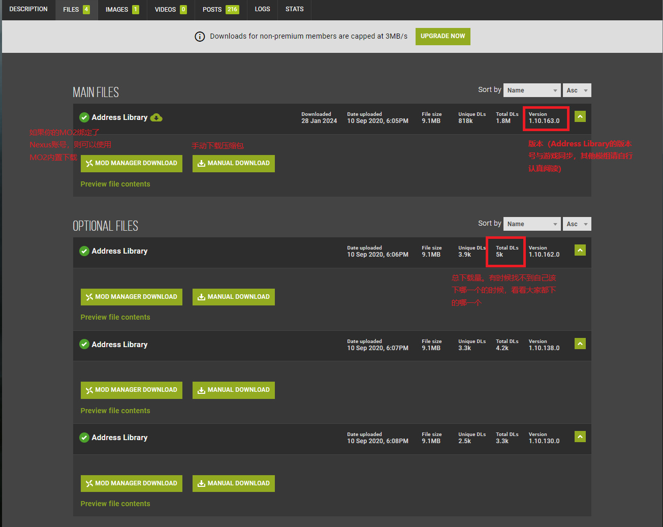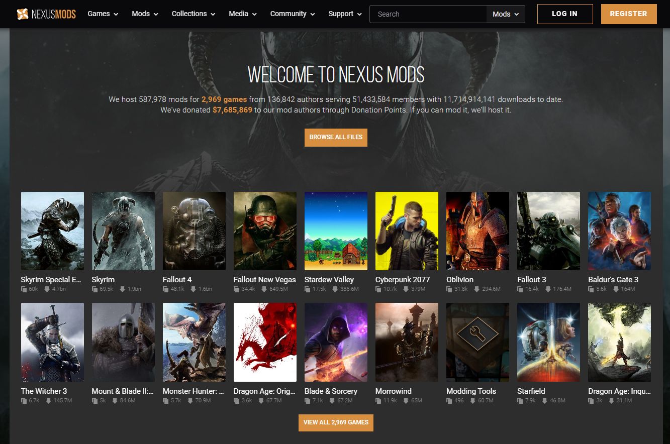 2.1 首先打开浏览器登录Nexusmods(N网),在右上角可以找到REGISTER,在这里免费注册一个账号,应该不需要魔法上网。Nexusmods在下载大于10Mb左右的大文件时可能会限速,可以下载一些第三方下载器。个人推荐开源免费的Motrix。
