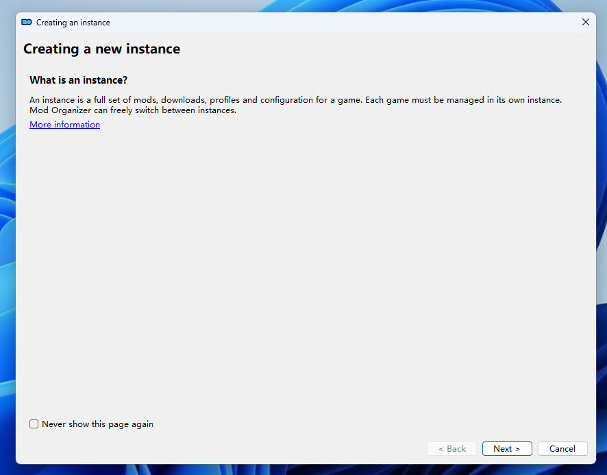 打开MO2,然后我们会看到实例创建向导。什么是实例?正如图中所解释的,实例就是你的数据库。你的模组,你单独的ini配置文件,你的存档,你的模组生成的各种文件,全部都放在实例里面。