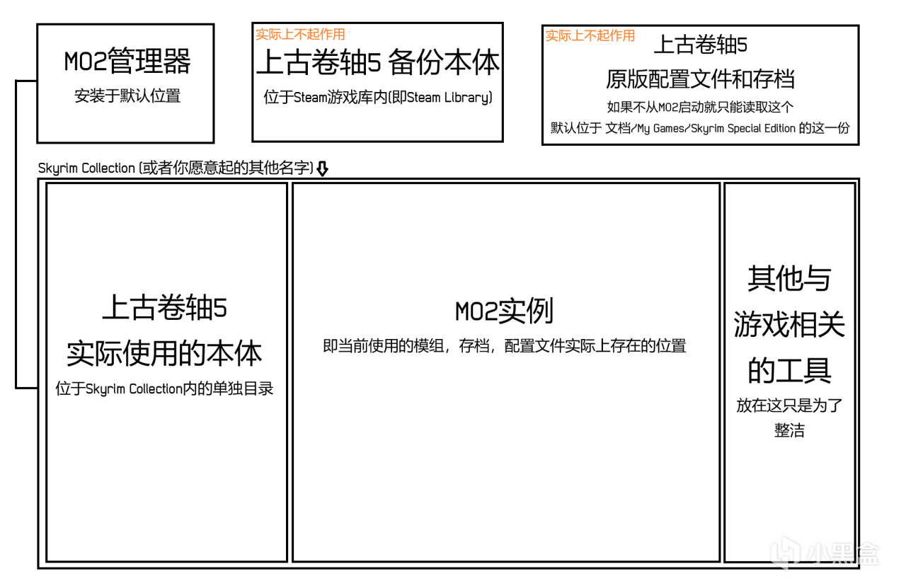 寻找一个独立于Steam游戏库和MO2管理器本体以外的第三方空间,以我个人举例,我在E盘的根目录创建一个名为“Skyrim Collection”的总体文件夹,日后MO2所创建的实例和游戏本体都分别放入其中,这样方便管理。