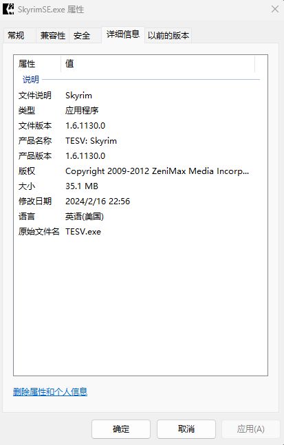 安装完成后,再次打开skyrimSE.exe的属性菜单,在详细信息里应该可以看到此时版本为1.6.1130。