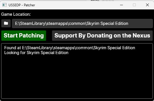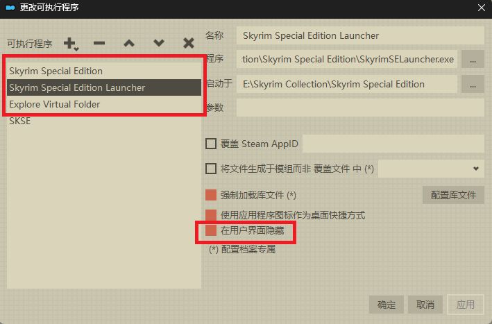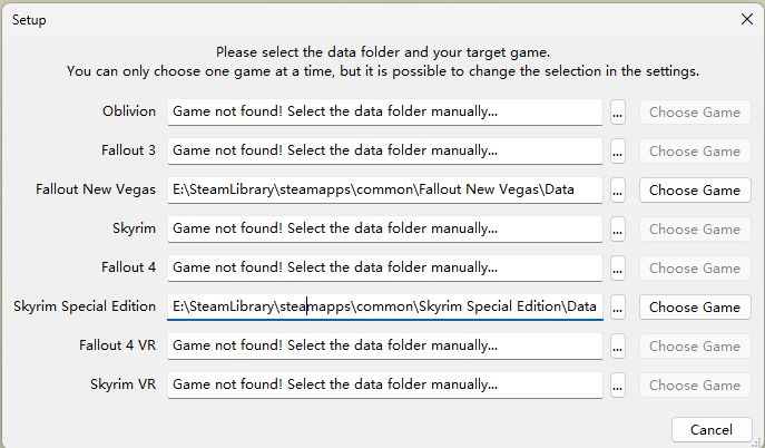 程序能够自动识别位于Steam安装目录内的游戏,但是不要忘了,我们实际上使用的是拷贝出来的单独本体!!一定要看清楚路径!在顶部选择我们拷贝出来的这一套本体,注意要选择到根目录下的SkyrimSE.exe。