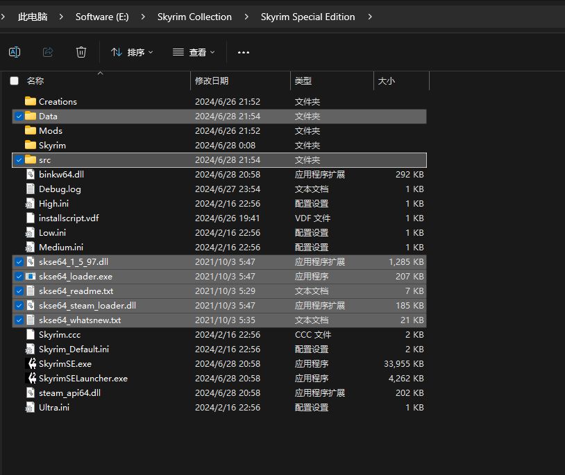 2.7 现在我们来安装上古卷轴5脚本扩展器(Skyrim Script Extender,也就是大家耳熟能详的SKSE)。它是所有涉及到稍微更改深层次逻辑的模组的必需品。不要忘了前文提到的,我们现在应当选择的是1.5.97版本的SKSE。下载地址在这里。下载后将散件放入游戏的根目录,不要放错目录了。安装完成后你的游戏根目录应当是这样的: