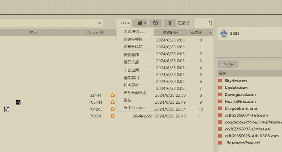 接下来,关闭MO2管理器,再次打开,MO2应该已经能够正常地识别SKSE了,你应该能在右上角的”运行“的下拉菜单处找到SKSE。