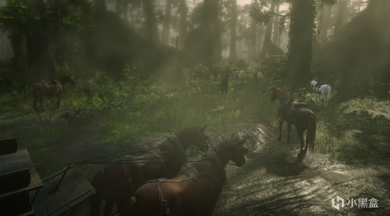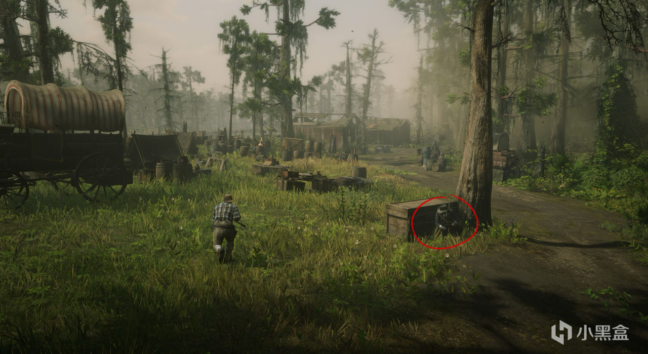 注意事項:難度不低的任務,乘坐馬車去抓捕私酒販子。在如圖所示位置可以前往自己的馬匹附近拿取連發步槍降低任務難度。