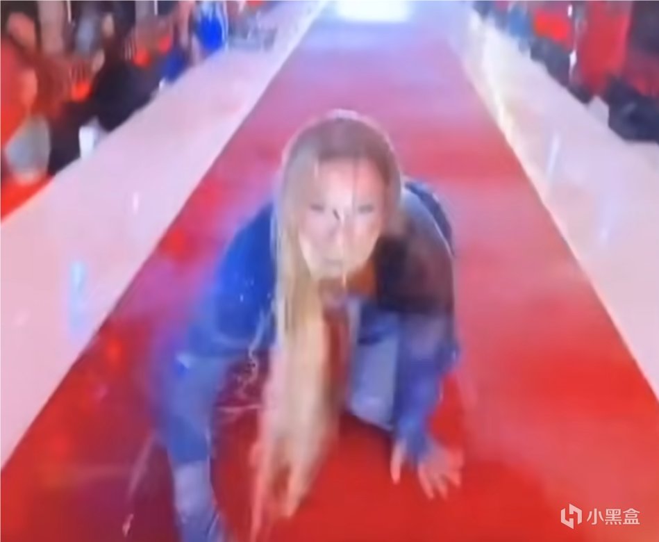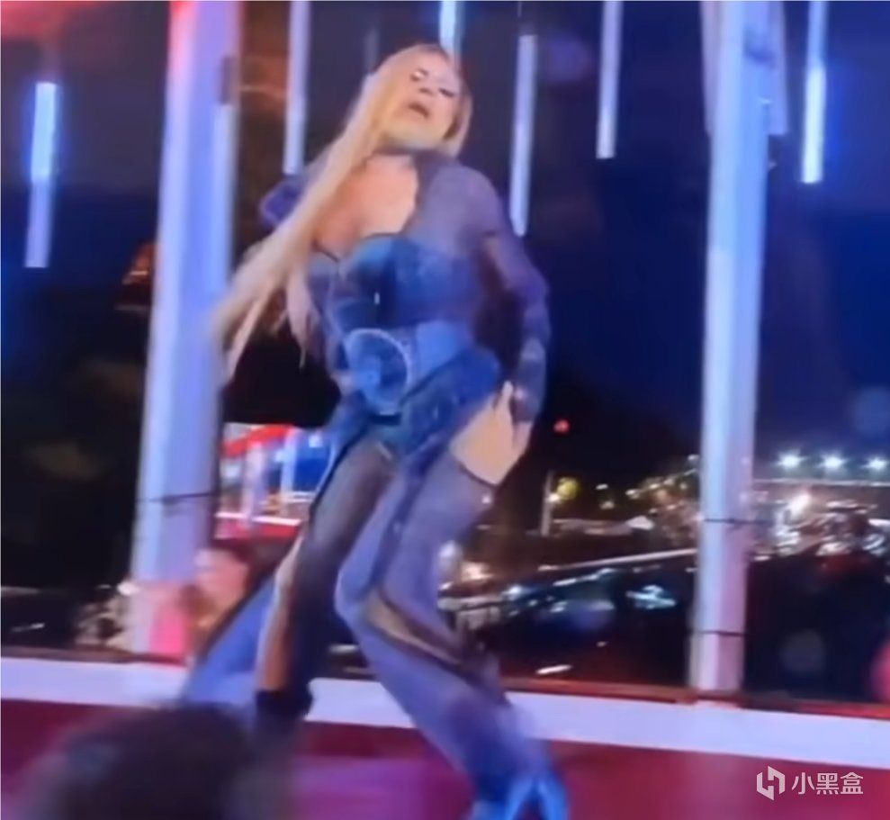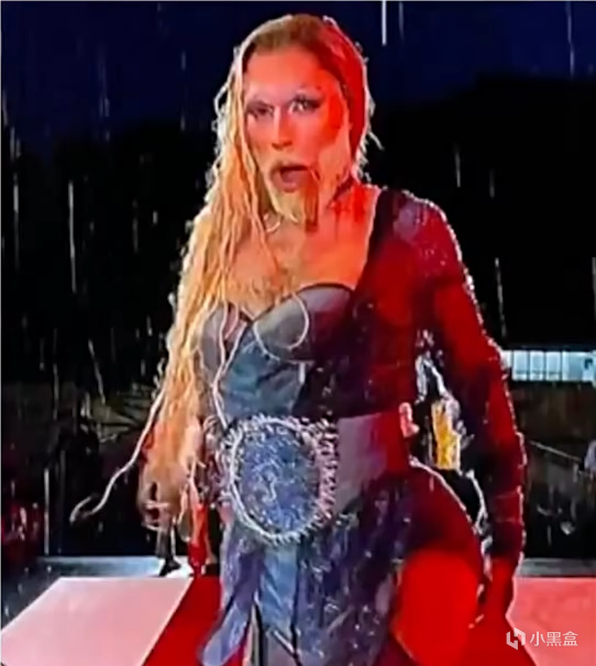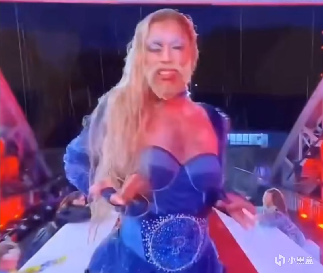 這個留着鬍子的男性,從身形和胸毛來看,顯然是生理男性。不過,如果只看他的裝扮,就會發現他塑造了一種不定性別的形象。在雨水的映襯下,他大膽地將頭髮甩在地上,並模仿貓步的姿態,展現出一種既戲劇化又富有表現力的表演。這樣的內容不僅挑戰了傳統性別的界限,還反映了當代社會對多樣性和性別表達方式的包容與接受,給觀衆帶來了深刻的思考和視覺的衝擊。這種獨特的表現無疑爲活動增添了豐富的色彩,也引發了人們對於身份和表現形式的廣泛討論。