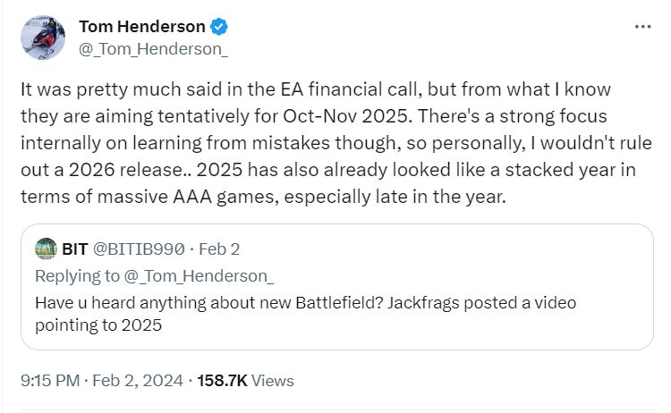 2.今年2月爆料届的三大舅舅党之一Tom henderson回答网友提问的时候说目前战地制作组内部的重点主要是在从过往错误学习。