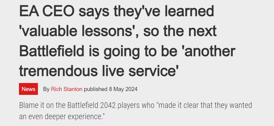 5月8日,EA ceo Andrew Wilson在2024 年第四季度财报电话会议中称:EA组建了有史以来规模最大的开发团队来制作《战地》新项目