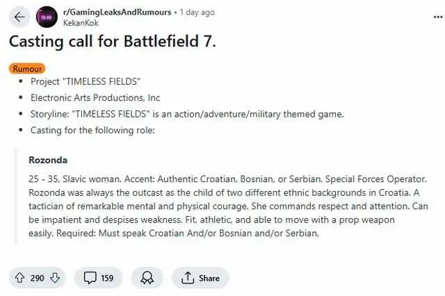 选角档案显示,角色设定为“克罗地亚背景的斯拉夫女性”,身份是“特种部队干员”,“性格急躁,蔑视弱者”。考虑到当下符合这个设定的EA游戏,战地的可能性非常大,于是目前普遍猜测新作的地理背景可能有克罗地亚。