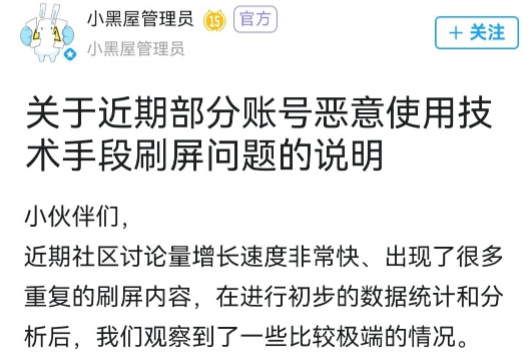 7月28日,米遊社官方“小黑屋管理員”發佈公告,聲稱遭到技術惡意刷屏。同時承諾會繼續加強評論管制和賬戶封禁措施,並且呼籲用戶和玩家一起對這些惡意刷屏賬戶進行舉報,共同維護論壇秩序。