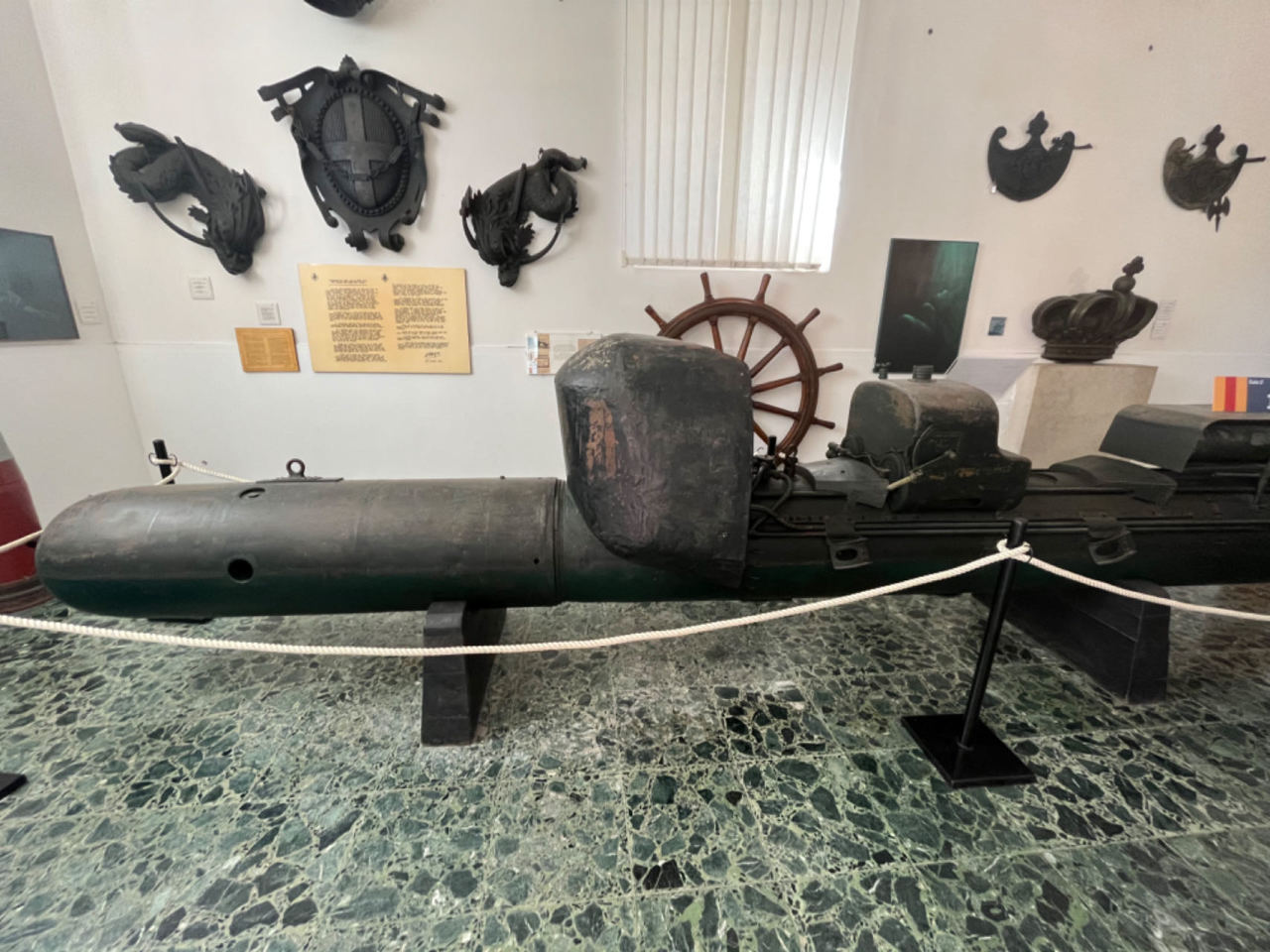 底樓所謂的“二戰意大利的水下攻擊艦”我沒有找到,倒是在二樓看見這艘潛艇(可能被搬上去了?)。可由兩人乘坐,能發射慢速魚雷偷襲敵方港口的艦船。幾個月後我在意大利半島另一側的拉斯佩齊亞海軍博物館也看到了這種潛艇,旁邊還寫着戰術圖解。