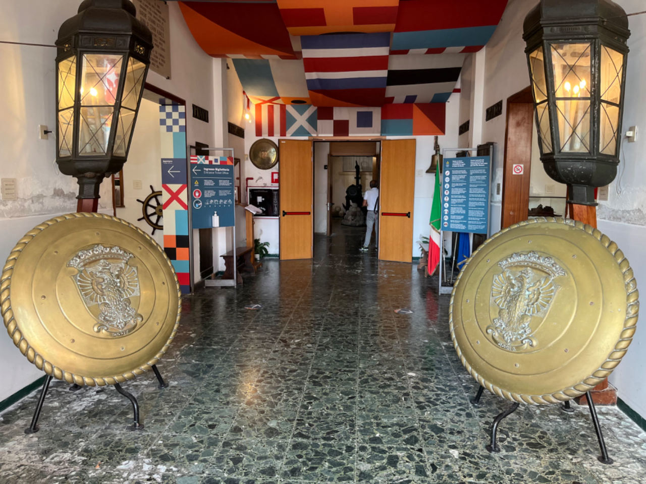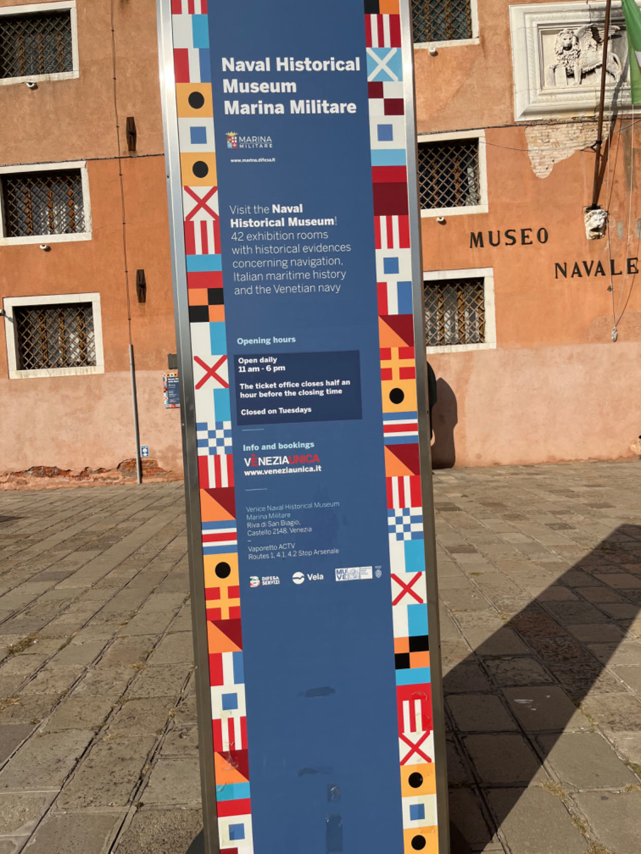 博物館外觀很低調,牆壁中間鑲嵌着聖馬可飛獅(每次都是它,城市的象徵、符號與吉祥物),掛着較早的意大利海軍軍旗,兩個顯眼的大船錨是從一戰老對頭奧匈帝國的艦船上卸下來的。威尼斯人就是喜歡掠奪戰利品,早年掠奪拜占庭的馬車,晚期掠奪奧匈的船錨。假如他們二戰打敗了英國海軍,可能會把納爾遜號的主炮也卸下來擺這裏炫耀。