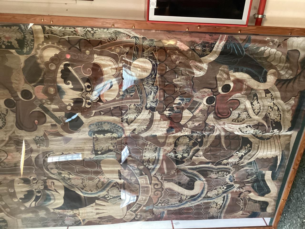 這一層還有中國與日本紡織物的臨時展出。中國的紡織物上繡着京劇臉譜,看上去像臉沒那麼黑的包公,底下還有一條瞪着眼睛的龍。龍的表情看上去有點亢奮,也許是想和本地的吉祥物聖馬可飛獅一較高下。兩隻神獸都會飛,誰贏不好說,也許飛獅有主場優勢。