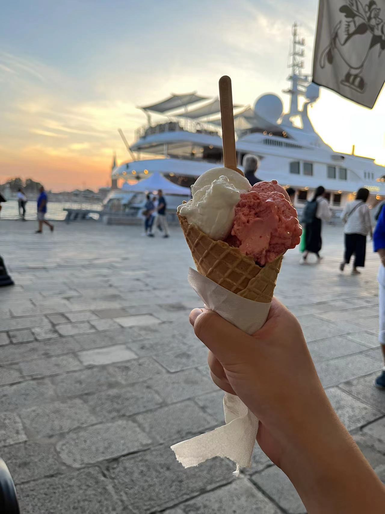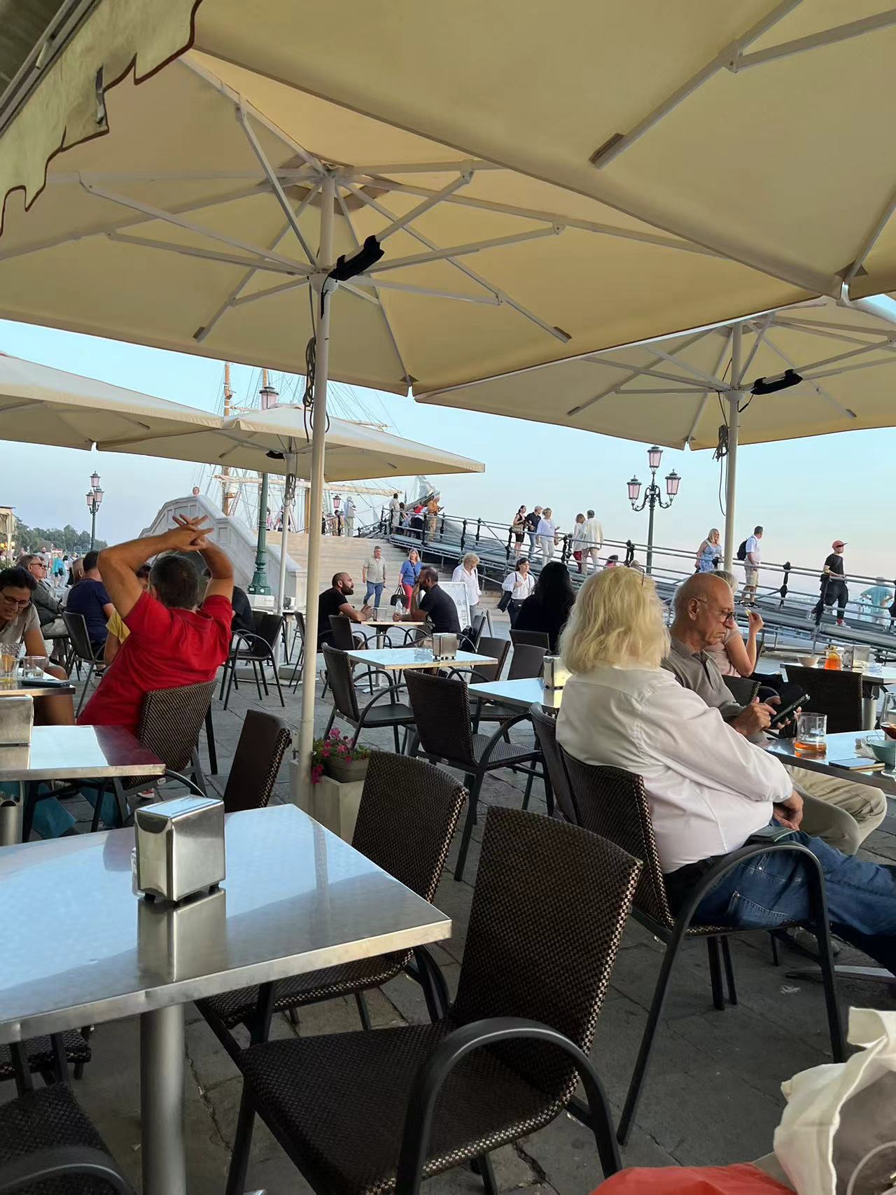 服務員也是個長得很俊的意大利女孩,排隊時順路在隔壁店買了gelato冰淇淋。坐在摺疊椅上,品嚐着服務員送來的酥脆原味薯片,不時嘗一口冰淇淋,抿一口雞尾酒,注視着左手邊的訓練艦、右手的遊艇以及來往行人。生平快事,莫過於此,除了自來熟的遊人不時搬走我桌子旁的椅子。