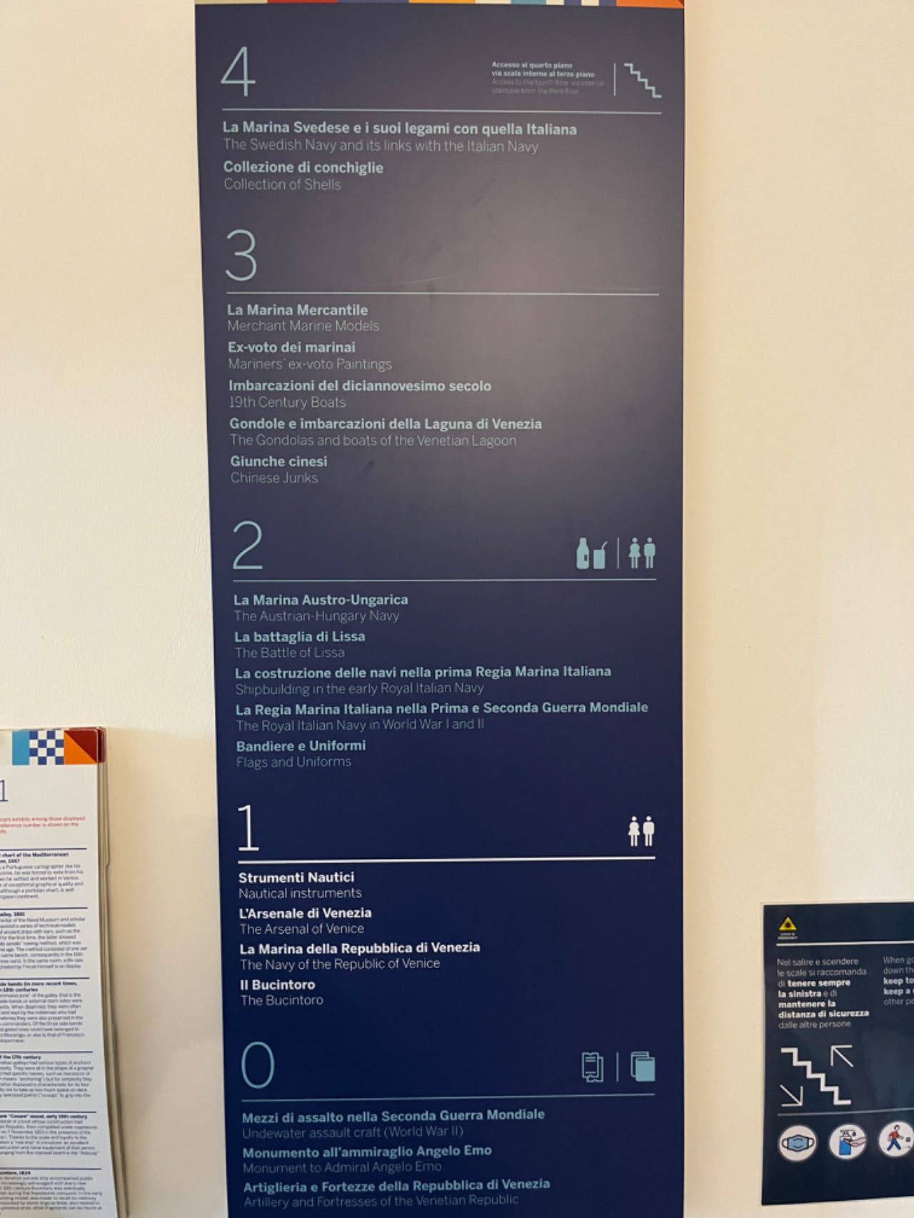 四樓:商船模型、水手生活、19世紀船舶、威尼斯潟湖的小船與貢多拉以及中國古代帆船相關。
