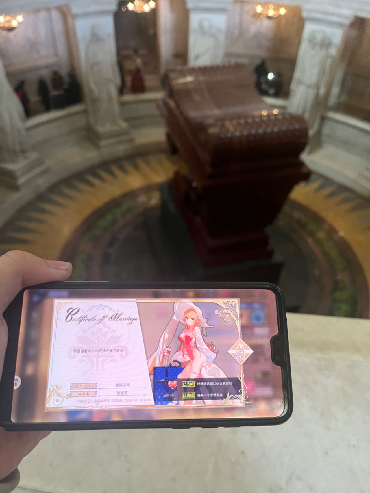 當然,這還不算完。在拿破崙與世長辭的兩百年後,一位年輕人在他位於榮軍院的墓前與鳶尾的旗艦許下了永恆的誓約。他這麼做的動機一半是希望自己自己的大婚能有更多的儀式感,認爲只有拿破崙纔有資格作爲證婚人,一半也是出於對這位自負到把自己送上海島的陸戰天才的嘲弄。反正拿破崙本人也沒有說什麼,也許他很樂意扮演證婚人角色呢。
