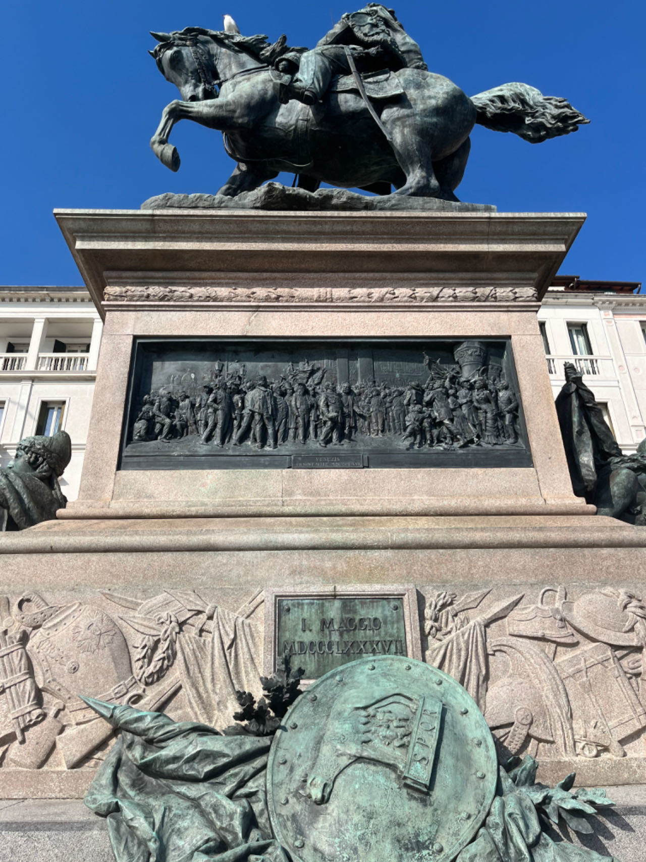 離開總督府沒幾步,遠遠看見了一個雕塑,這便是著名的維托里奧·埃馬努埃萊二世紀念碑。頂端的人駕馭着駿馬,手中的刀高高揚起,可能是化用了這位意大利開國君主的形象,底部是戴着威尼斯總督冠冕的女人及聖馬可飛獅的雕像。