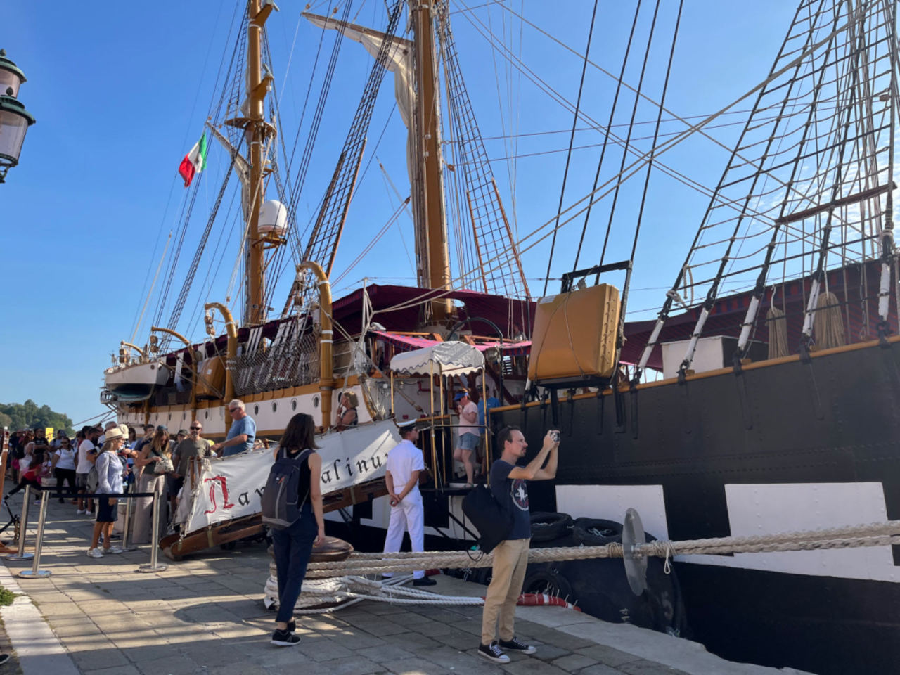 我本意是奔往海軍博物館,卻遠遠看到它對面停泊喆一艘風帆船模樣的大船,船前是排着長隊的遊人。我按捺住內心的激動跑了過去一探究竟,原來它就是大名鼎鼎的意大利海軍Palinuro級A-5311“Palinuro”號三桅風帆加柴油機航海訓練艦。它比起刺客信條2裏威尼斯港口停泊的帆船要大得多。