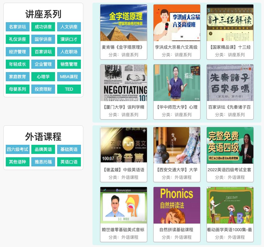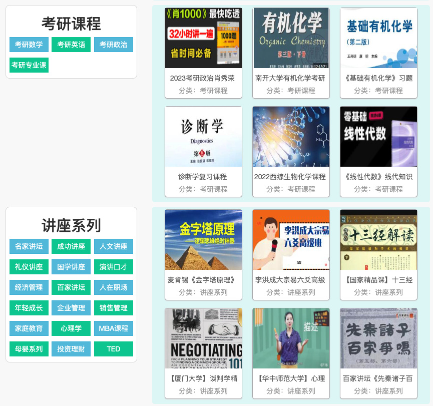 还有各类技能学习的课程,比如外语、资格证考试、讲座等。