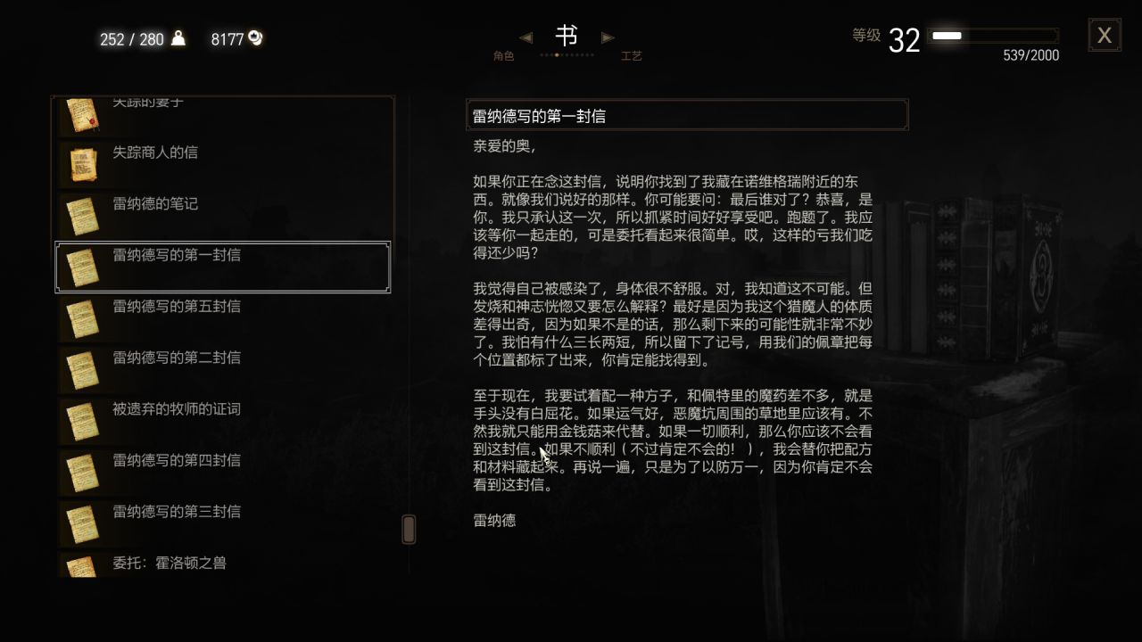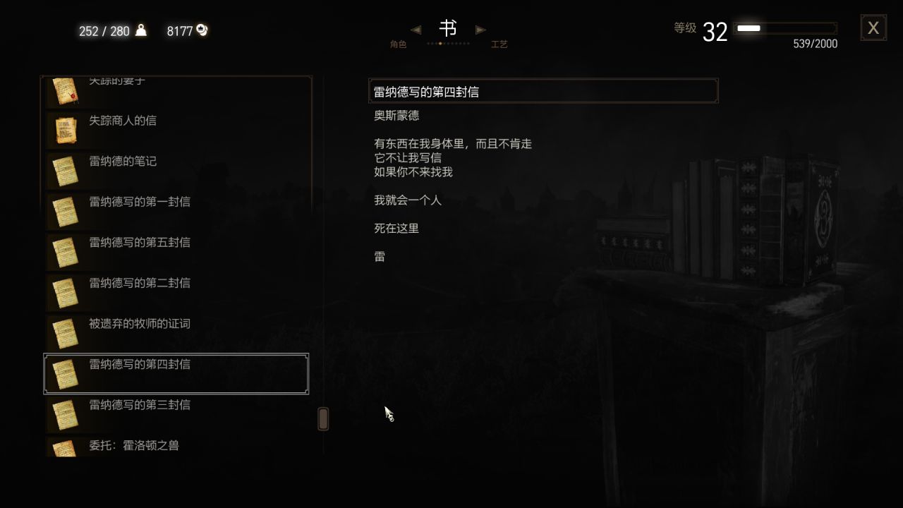 他一直在給奧斯蒙德寫信,信當然寄不出去,在恍惚狀態下,寫給“親愛的奧”的信就是他與瘟鬼抗爭的精神寄託,稱呼從一開始的“親愛的奧”與“雷納德”到“奧” “奧斯蒙德” 與“雷”,這是一個反映雷納德狀態的小細節,從第四封信之後,雷納德把自己與瘟鬼封印了。