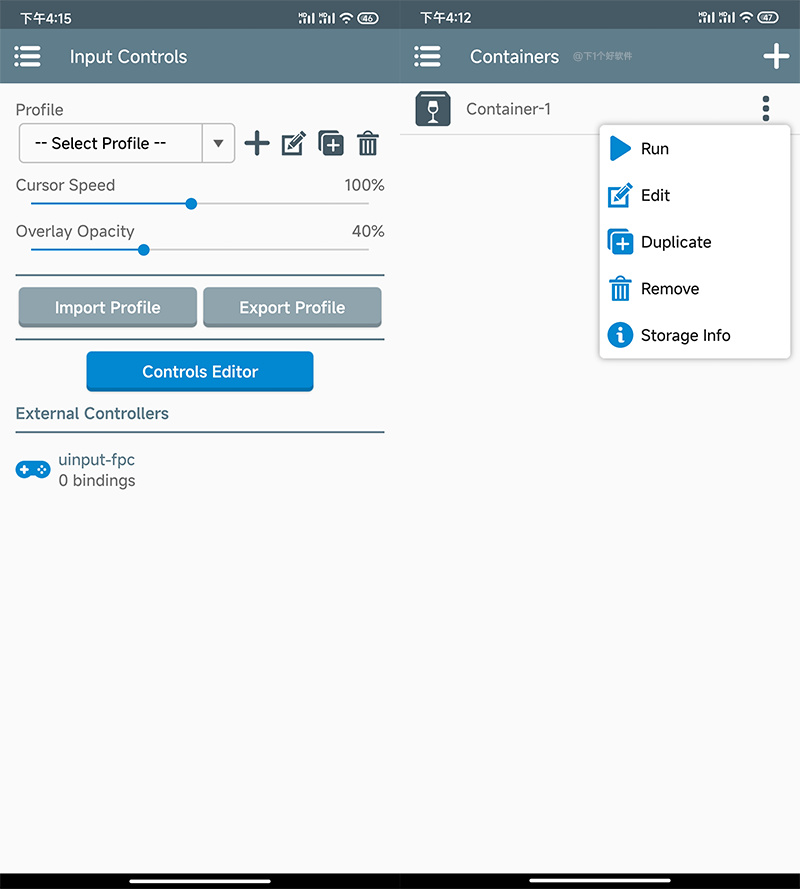 5.设置控制鼠标指针移动速度,可以创建多个方案,如果你有输入设备,如手柄的话,也可以进行设置。然后点击容器,Run 开始运行。