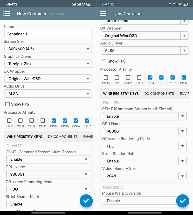 4.创建容器,这里可以选择屏幕分辨率、显卡驱动、音频驱动、CPU的核心数、是否显示 FPS、显存大小等。