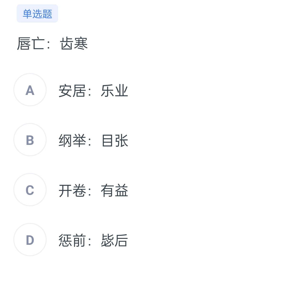 看起來就是摸不着頭腦的給你幾個詞語,其實就是讓你分析詞語之間的邏輯關係以本題來說,脣亡齒寒,大家都知道,脣亡了,齒纔會寒冷,這是有因果以及先後的邏輯在的,大家可以自行分析一哈,應該還是好做的