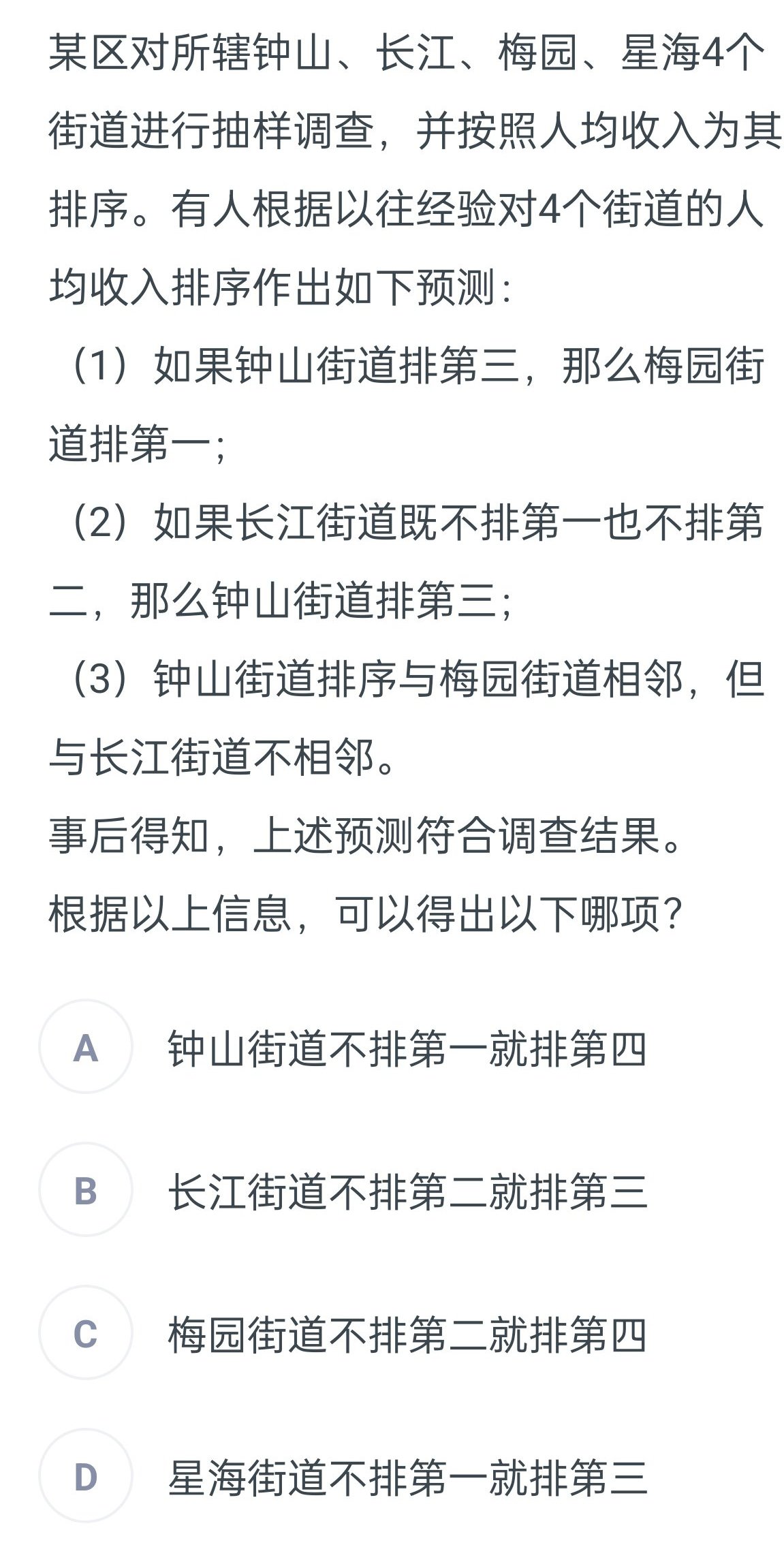 這種題我就不太多說了我只會正常的列出來然後找矛盾,個人感覺費多少時間真挺看運氣,也找不到什麼簡單方法,就時間性價比來說略虧,建議大家視個人情況選擇做或者不做,如果數量關係水平還可以我是建議留着做那個的