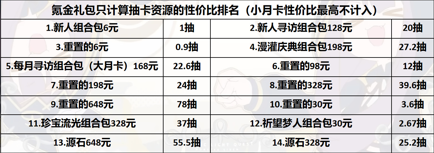 氪金禮包按照抽卡性價比排序。請謹慎氪金不要上頭。大部分氪金禮包都不如大小月卡。