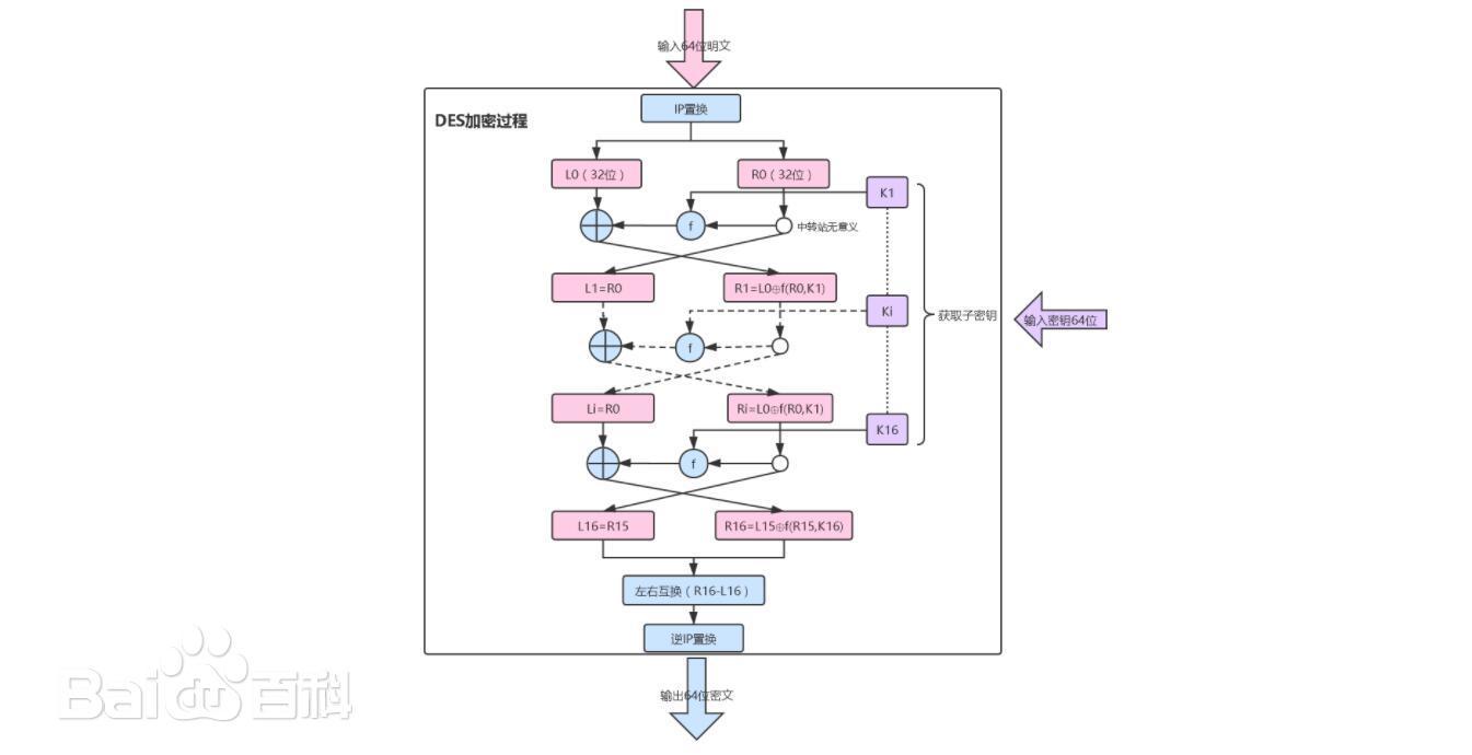 讲完DES的加密,解密就很简单了,在加密中,密钥的作用是与左半边逐位进行异或(a和b异或时,如果a、b两个值不相同,则异或结果为1。如果a、b两个值相同,异或结果为0),由于异或具有可逆的性质(即a与b异或后,再异或b可以得到a),所以DES解密算法是DES加密算法的逆,直接倒着运行一遍就能得到明文。