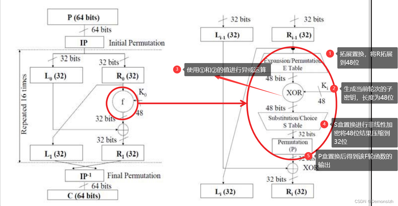 这部分通俗的解释是,把要加密的信息分成两半,右边直接输出到下一轮作为下一轮左边的输入,左边和对称密钥一起输入到一个加密函数F里(也是类似于上面IP置换的置换),得到的结果与右边信息异或后作为下一轮的右边。