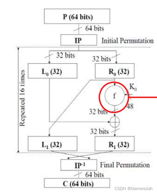 然后进行正式的加密,DES加密算法共有重复的16个轮次,在每个轮次中,右半部分R0会作为下一轮次的左半部分L1的输入。其次,R0会补位到48位和本轮次生成的48位密钥K0输入到F轮函数中去。F函数的输出结果为32位,结果F(R0,K0)会和L0进行异或运算作为下一轮次右半部分R1的输入。以此类推,重复16轮运算。