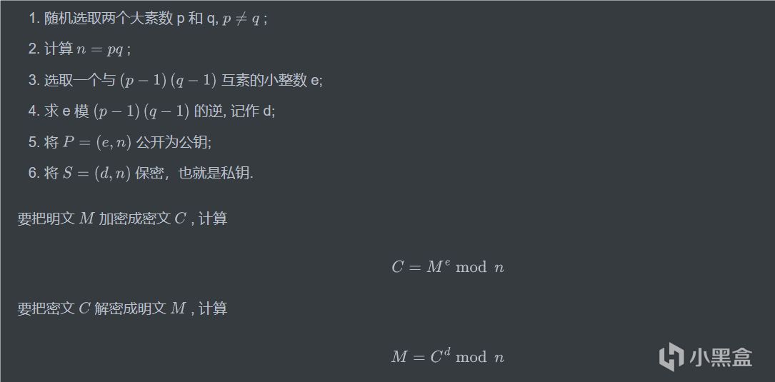 小黑盒没法打公式,我就在自己电脑里写好过程截图吧,RSA加密过程用最简单的话说是这样的:
