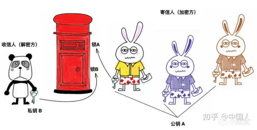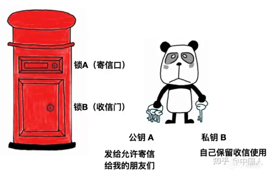 每个人都有锁A的钥匙,给你寄信时,只需要打开你的邮箱就可以投递,但是一旦投递,信就会掉到邮箱底部,你无法对其进行解密,只有邮箱主人利用自己的私钥(也就是锁B的钥匙)可以打开底部的锁,拿出底部的信。