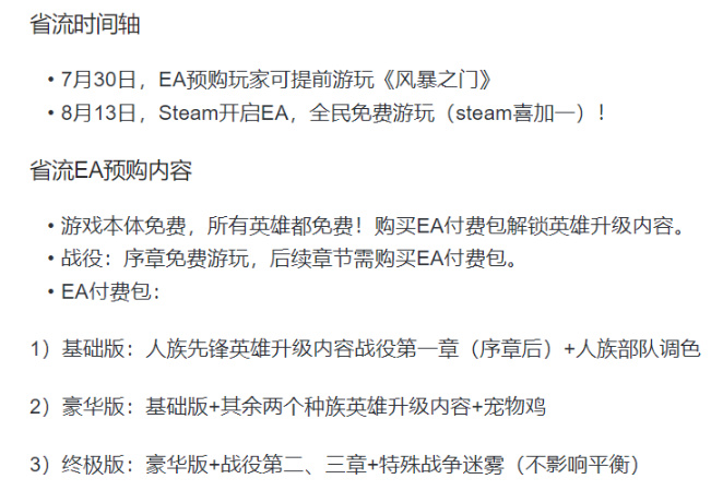 图示的内容已经足够清晰,那么说的再清楚一些就是:8月13游戏正式解锁,本体免费,可以游玩PVP以及PVE序章内容、解锁全部PVE免费英雄;128元版本额外获得人族先锋英雄升级内容,以及战役第一章;198元版本比上述多了两个种族英雄升级内容+宠物小鸡;298元版本则解锁战役第二、三章以及特殊战争迷雾(装饰)。