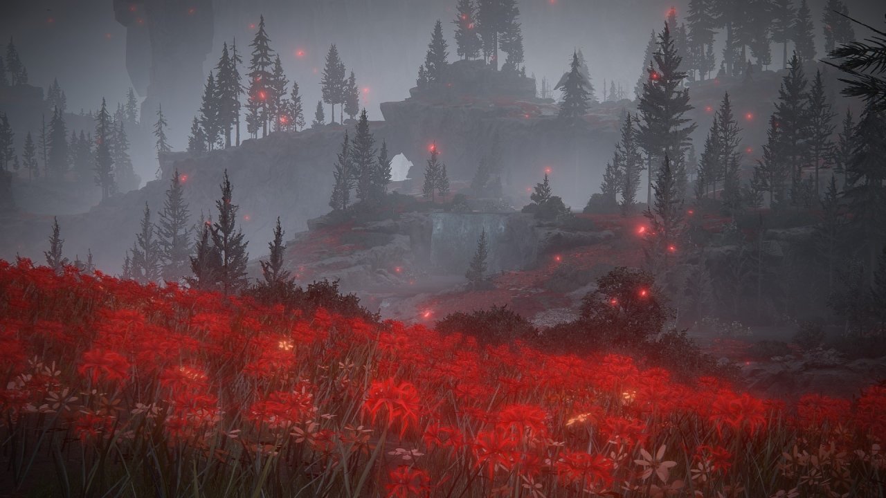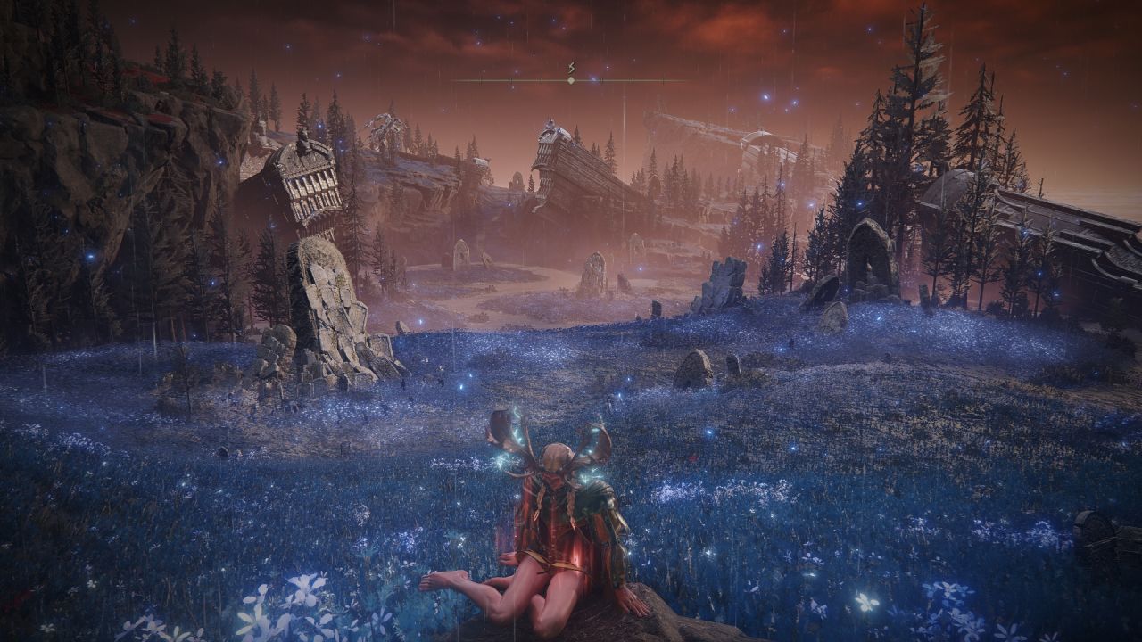 《艾爾登法環》的本體的風景就已經讓我無比沉醉,而《黃金樹幽影》的美術水平甚至要高出一等,雖然我最喜歡的場景依舊是本體中的「永恆之城」,但「幽影之地」的奇觀簡直是層出不窮,美不勝收,又一次滿足了我對奇幻世界的遐想。當我踏進墓地平原的那一刻,黑暗扭曲而瑰麗的巨大幽影樹就給足了我視覺上的滿足與震撼;青藍海岸那驚豔無比的藍色花海讓我彷彿置身於夢境;百花盛開的巫者村讓人沐浴在靜謐與悲涼中、風雷大作的尖刺山充滿末日的氛圍、巧奪天工的神之塔再次將FS的西式建築美學展現地淋漓盡致......每個區域都有截然不同的風貌與氛圍,我幾乎每到一個新區域都會寫下“前有絕景”,而我留下的這些諫言過不了多久便會收穫數十個好評,一邊欣賞絕景一邊收到共鳴的感覺着實令我心曠神怡,哪怕是讓我在幽影之地看上一整天的風景,我也樂此不疲。