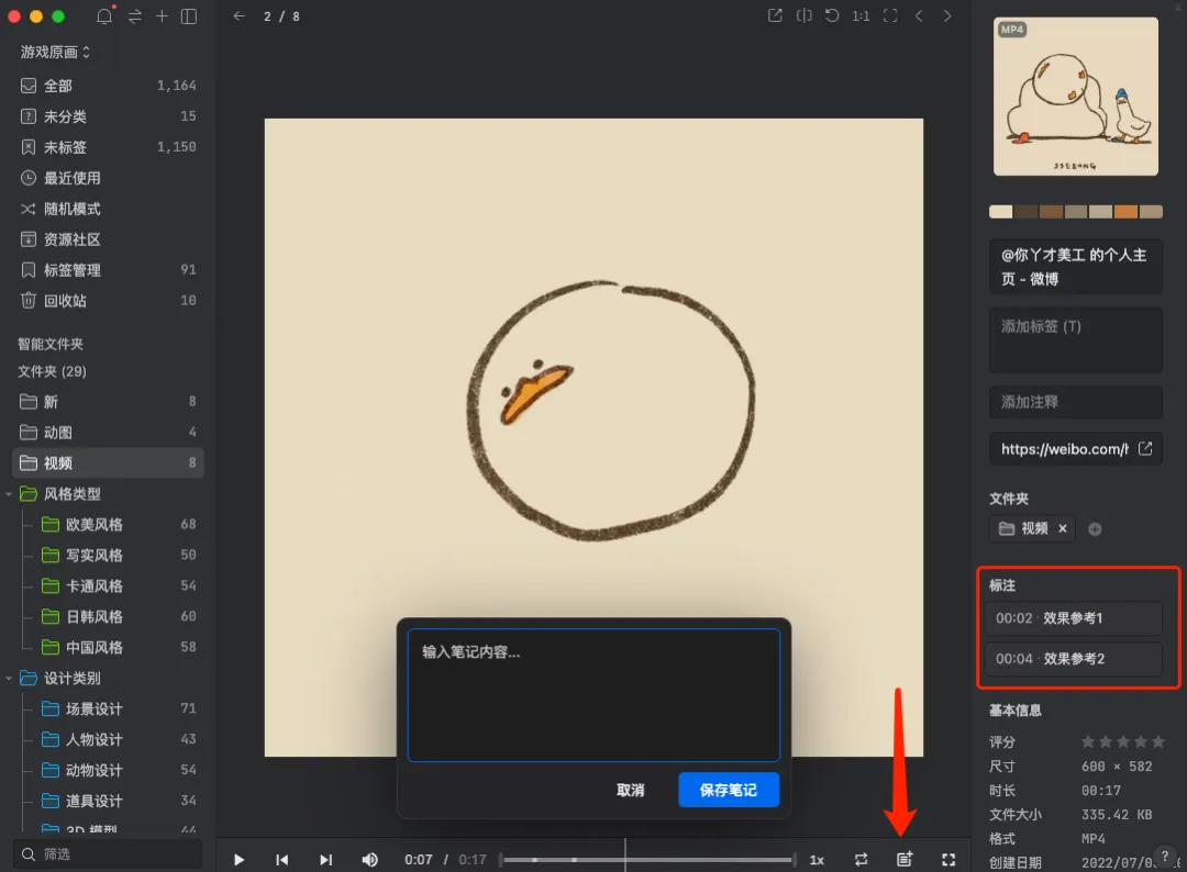 當你用 Eagle 瀏覽視頻素材,點擊右下角添加視頻筆記,下次打開之後在右側點擊筆記就會自動跳轉到標記區域,用來觀察學習他人的視頻創作技巧十分方便。