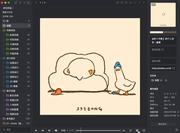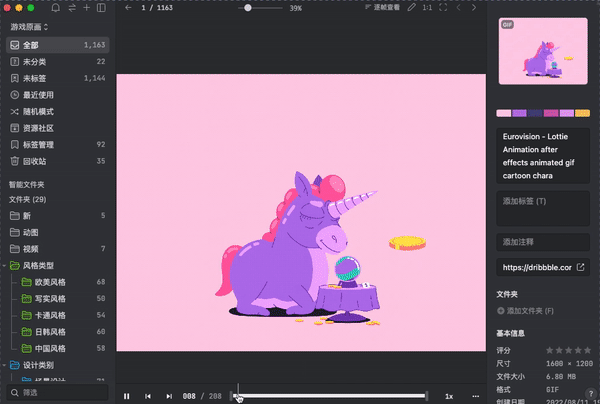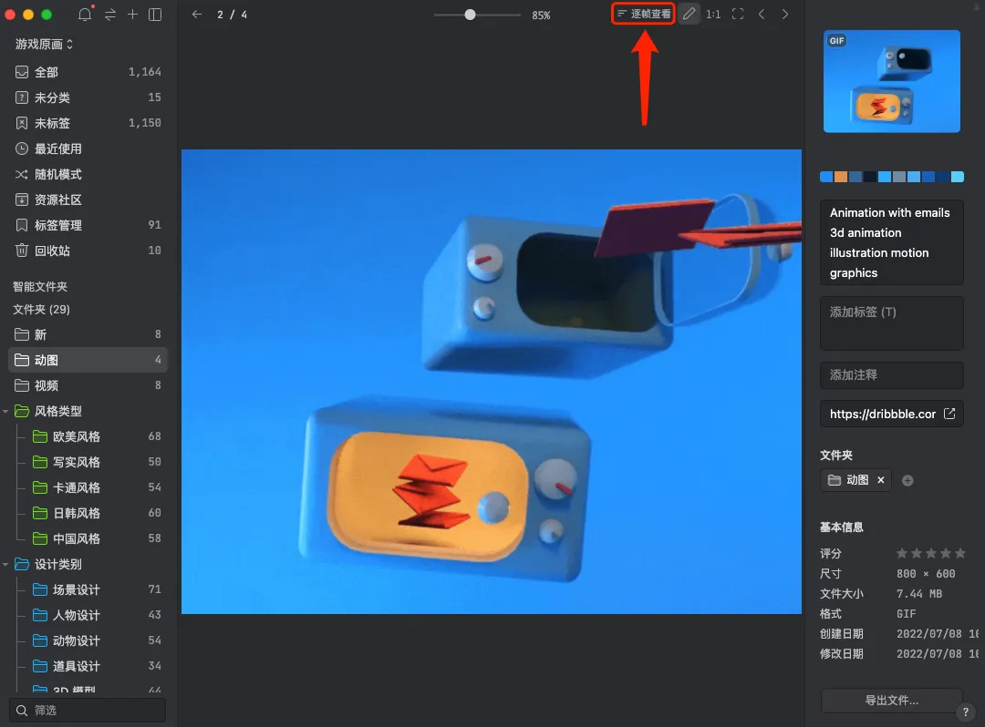 Eagle 瀏覽動圖時可以逐幀查看,以便大家參考學習別人的動態設計,手動點頁面右上角的【逐幀查看】即可激活此功能。